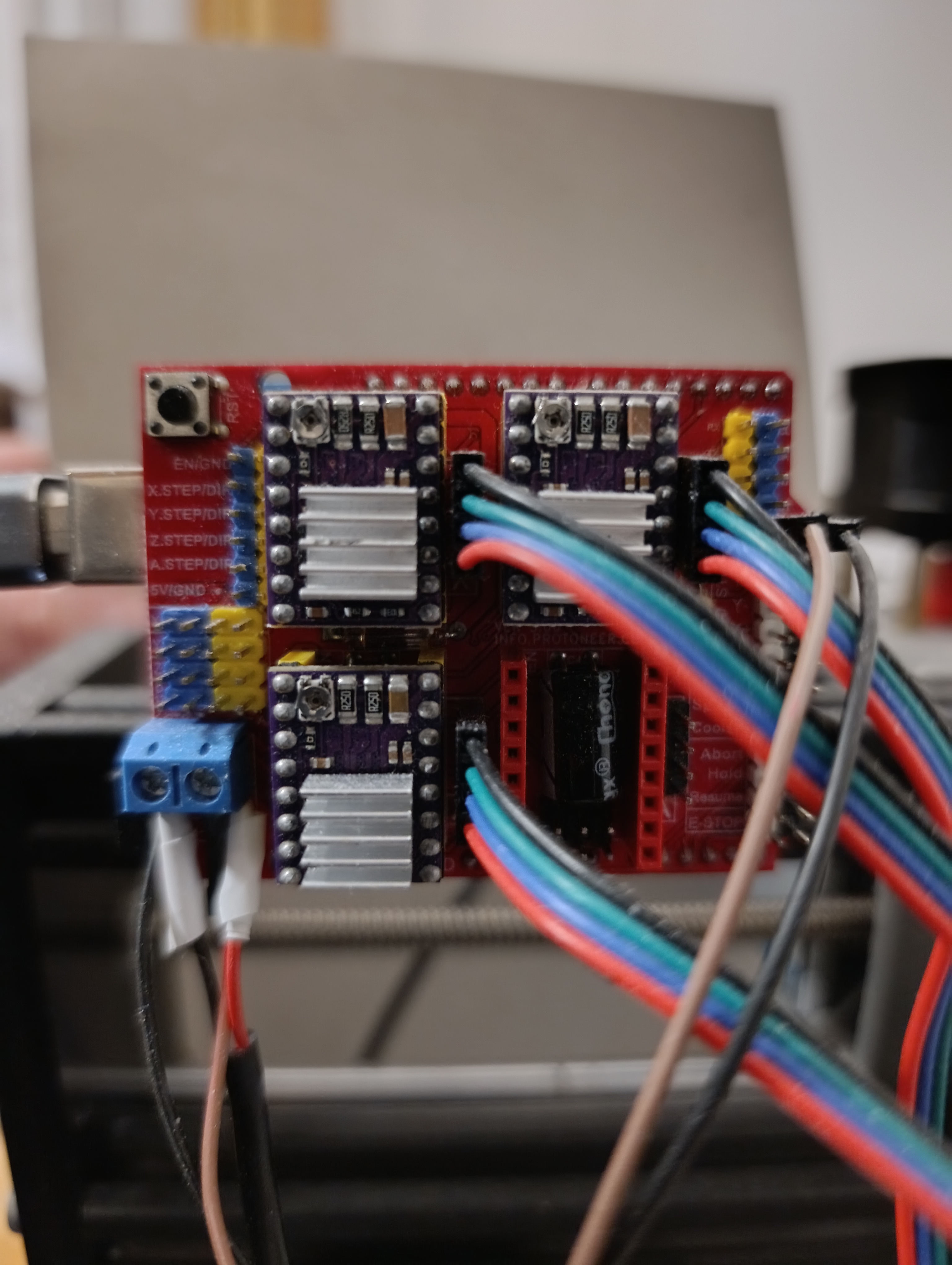 On the CNC Shield V3, the four motor output pins are located on the right side of each stepper driver, and these pins form a single 4-pin connector labeled A+, A–, B+, and B–. This connector is used to attach the stepper motor directly to the driver’s output stage. The motor’s own four-wire connector is simply attached to these four pins in order, without the need to identify coils or internal wiring; the user only needs to connect the four wires to the four available terminals. If, after powering the system, the motor rotates in the opposite direction, the correction is straightforward: power off the machine and reverse either the A+ / A– pair or the B+ / B– pair.
