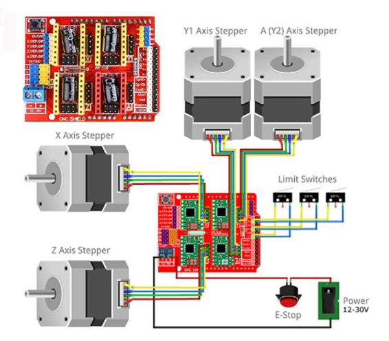 On the CNC Shield V3, the four motor output pins are located on the right side of each stepper driver, and these pins form a single 4-pin connector labeled A+, A–, B+, and B–. This connector is used to attach the stepper motor directly to the driver’s output stage. The motor’s own four-wire connector is simply attached to these four pins in order, without the need to identify coils or internal wiring; the user only needs to connect the four wires to the four available terminals. If, after powering the system, the motor rotates in the opposite direction, the correction is straightforward: power off the machine and reverse either the A+ / A– pair or the B+ / B– pair.